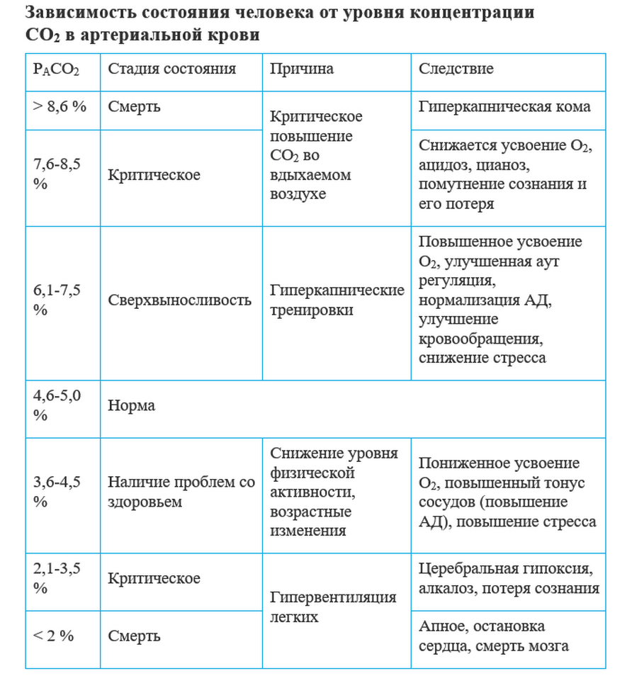 Для убедительности приведу таблицу, в которой видно, что с возрастом процентное содержание СО2 в артериальной крови уменьшается до 3,6-4,5 %. Это процентное уменьшение СО2 и приводит к проблемам со здоровьем в основном у возрастных пациентов и постепенно приводит к старению тканей, органов организма из-за недостаточности снабжения их кислородом (напомню смысл парадоксальной причины - для усвоения клетками организма кислорода в крови должно быть достаточно СО2, так как без углекислого газа кислород из крови не способен отделиться от гемоглобина и в результате недостатка СО2 результат - тканевая гипоксия).