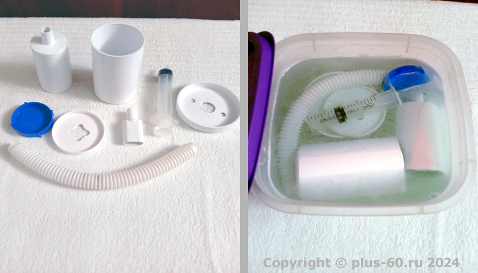 Набираем чистую воду в пластиковый контейнер и опускаем две таблетки. Ждем полного их растворения. Обычно раствор становиться синего цвета. Погружаем в него все части нашего тренажера, обращаем внимание на то, чтобы из воздушной трубки и частей тренажера вышел весь воздух и не забываем наполнить дозировочный шприц раствором.