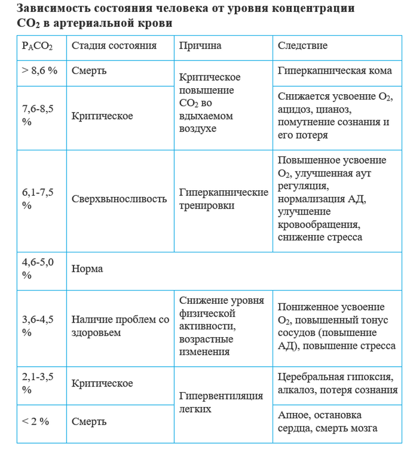 Однако в данной ситуации очень опасной тенденцией является значительное превышение содержания углекислого газа (СО2) в смеси, что может привести к получению обратного лечебному эффекту, а в иных случаях (при значительном превышении содержания СО2) и к летальному исходу для тренирующегося.