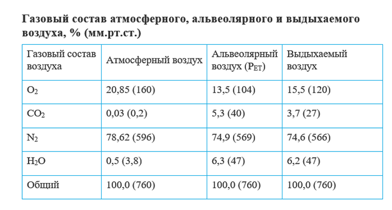 Для общего понимания ситуации приведу газовый состав воздуха в атмосфере, в альвеолах легких и в выдыхаемом воздухе:
